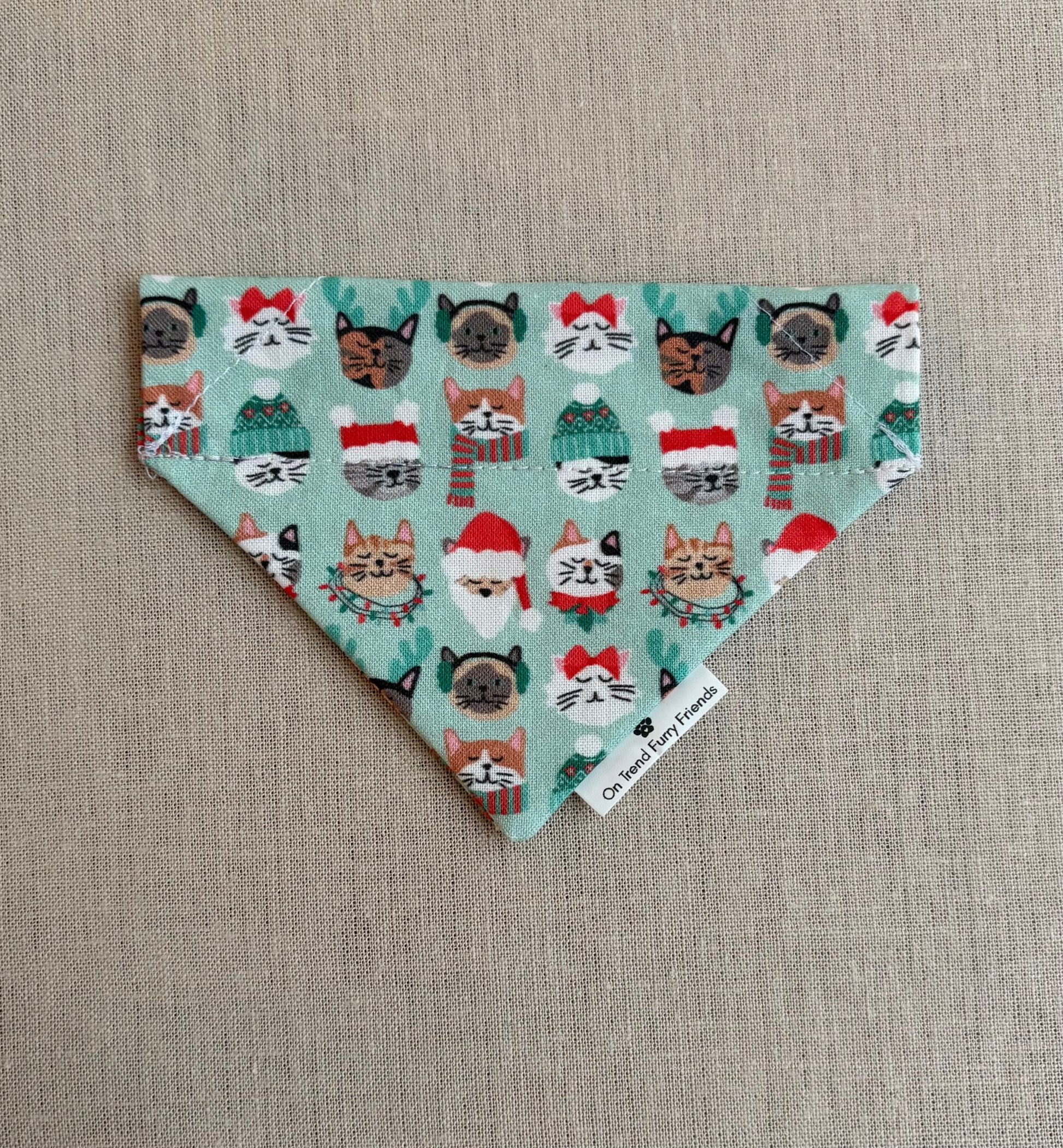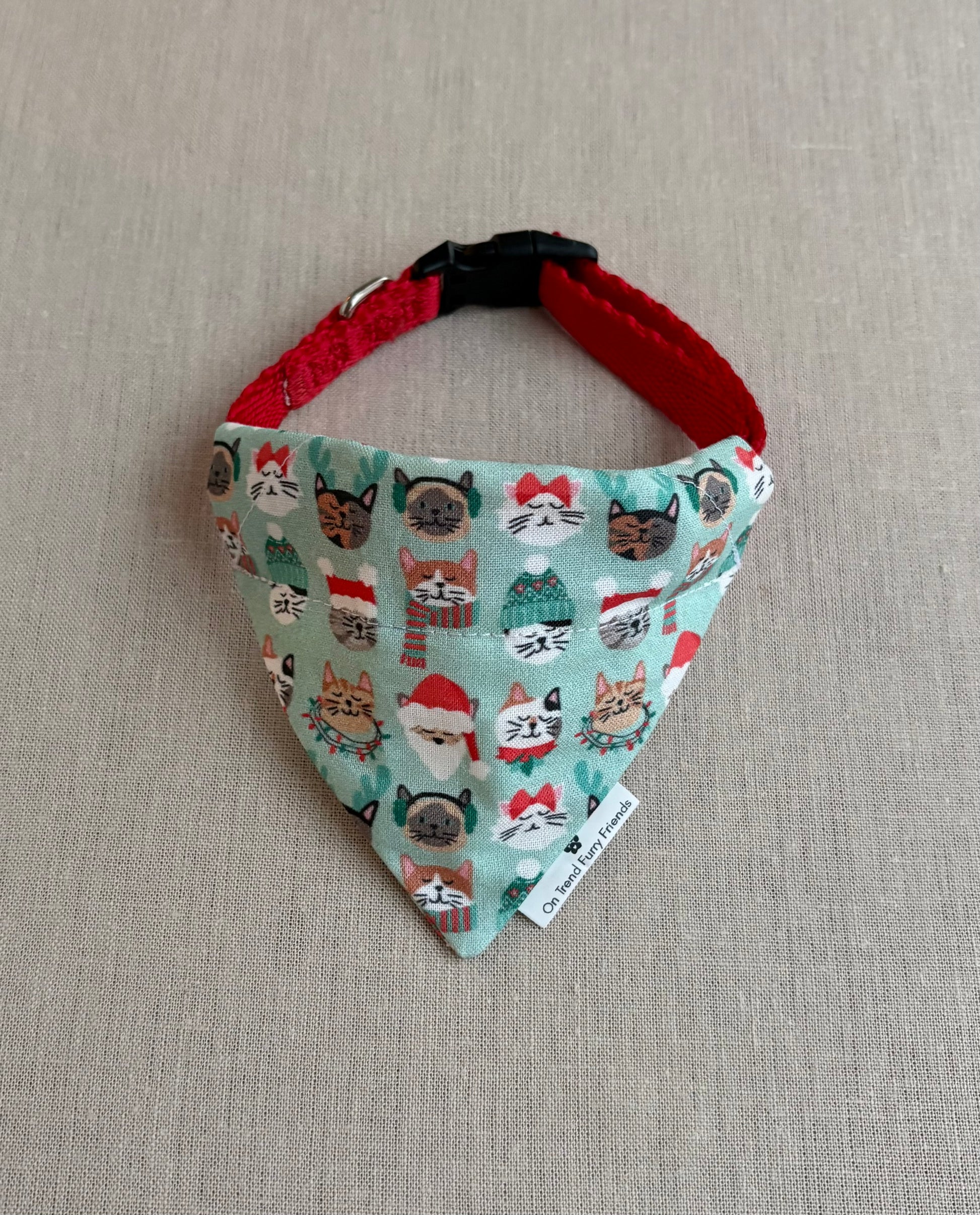 These Christmas Cat Faces scarves are perfect for all your Holiday Festivities with your kitty! They are made from 100% cotton and slide over your pet's collar for an easy fit--and are available in XS and S sizes.